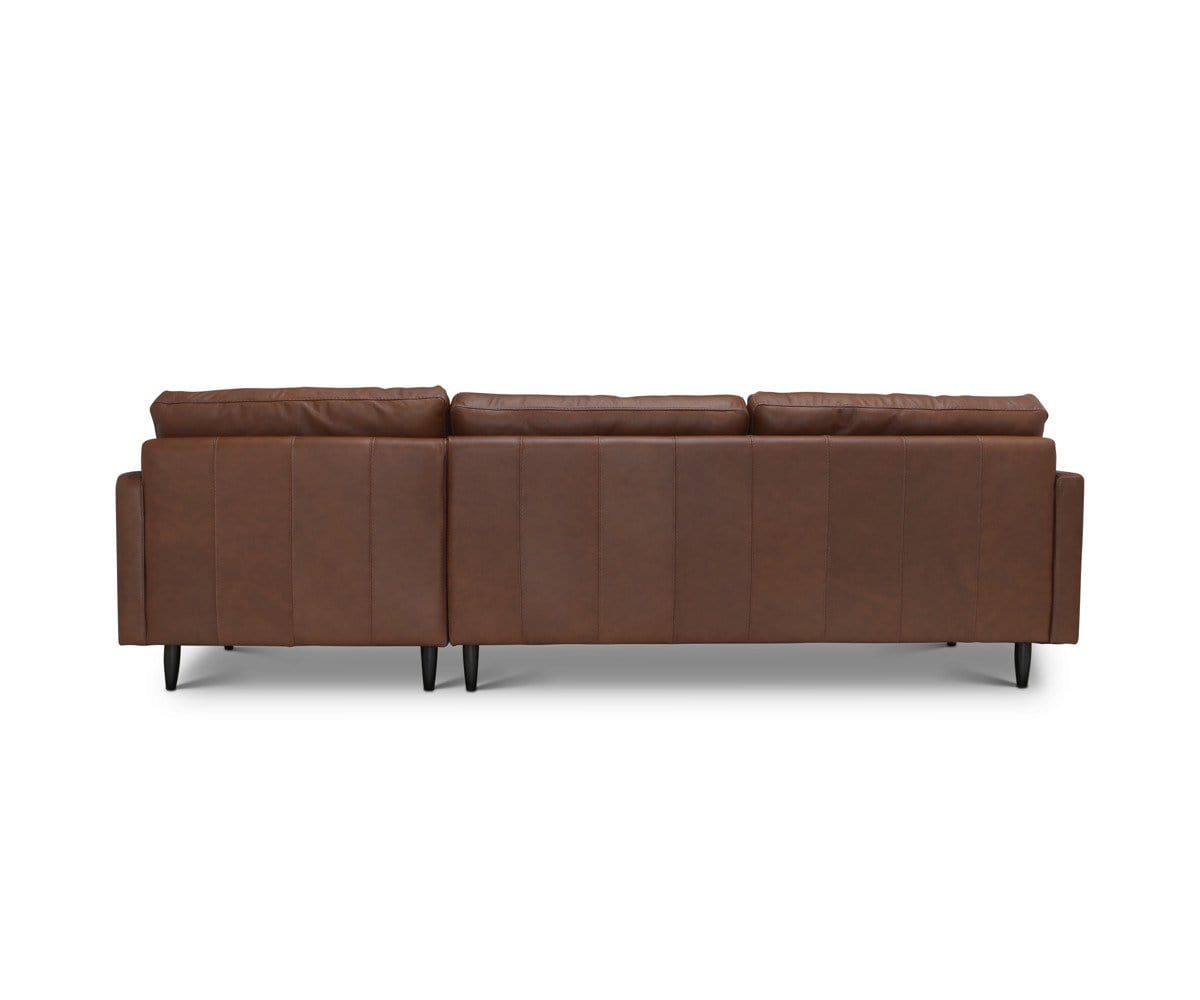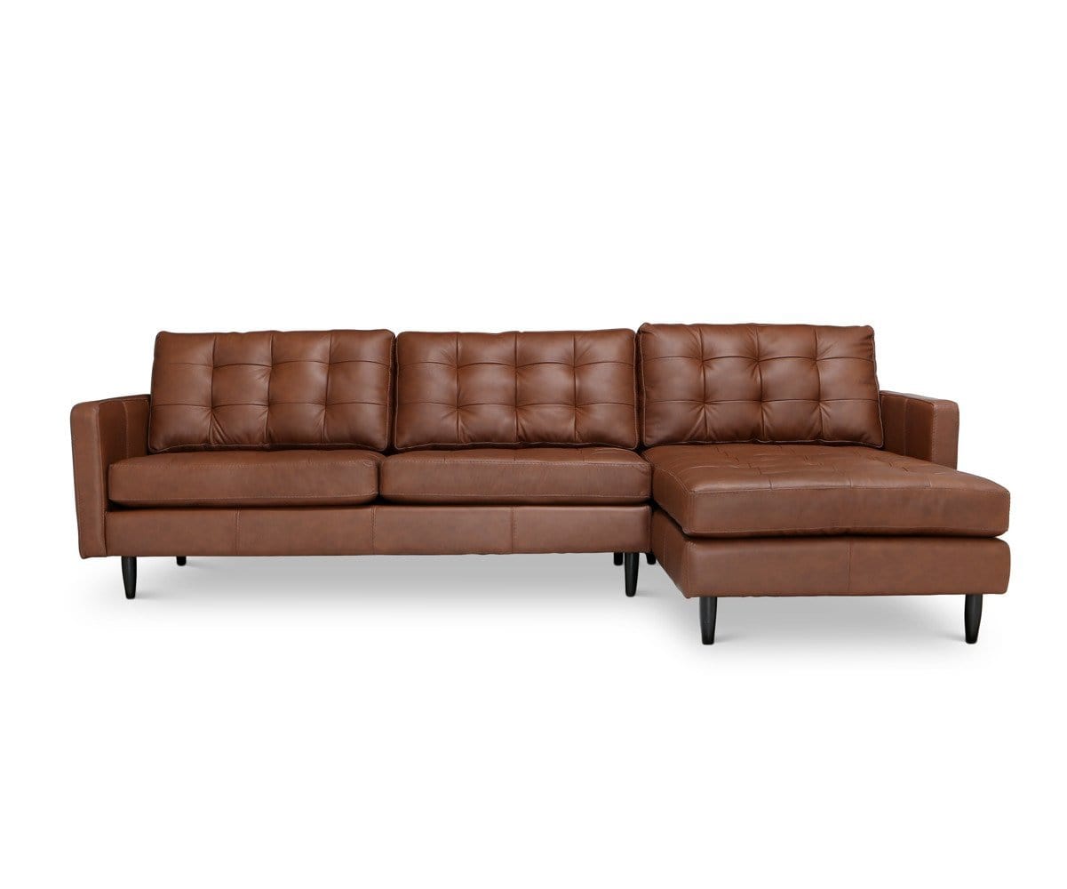 The Tora chaise two-piece sectional is a distinguished and comfortable seating option for any home. Made in the USA, this piece's rich leather upholstery surrounds overstuffed cushions and a refined, contemporary frame. Button-tufted backrests provide visual interest and added strength to the upholstery. Solid wood tapered legs complete the look.