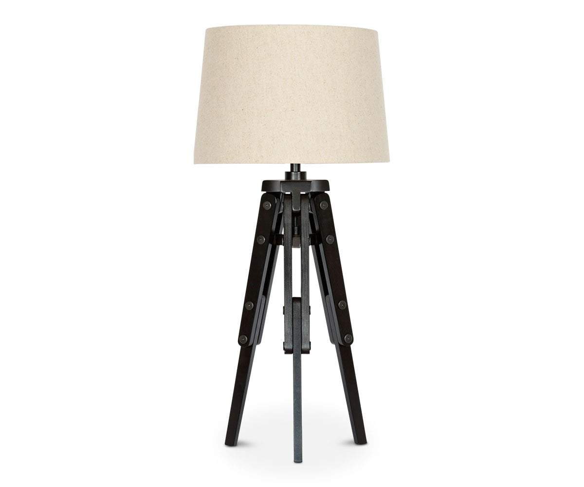 Fitting for industrial chic or steampunk spaces, the Tripod wooden table lamp makes a statement with its unique base. The dark brown wooden tripod frame resembles camera tripods and artfully supports a light fabric drum shade.