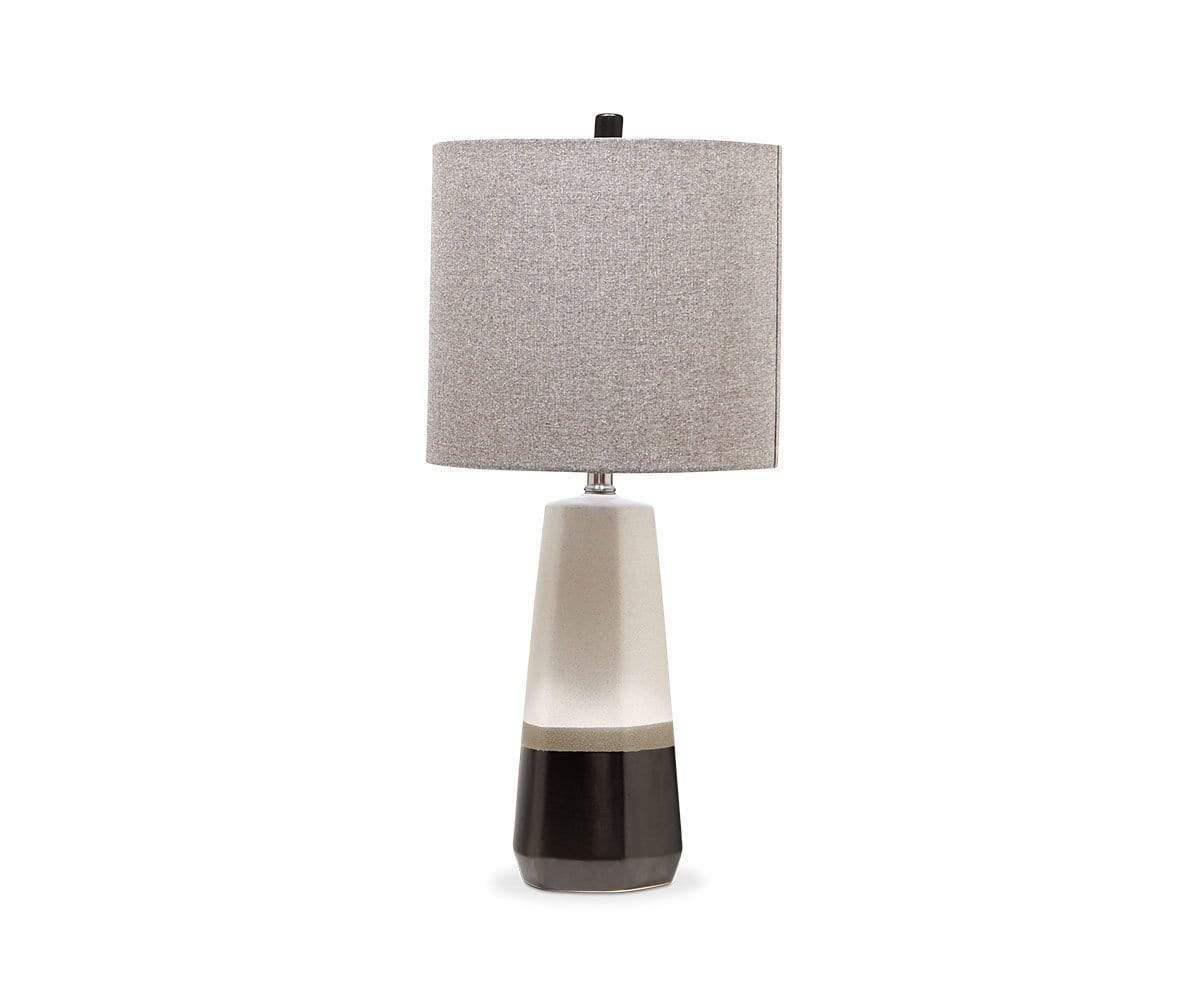 The Tunnusta table lamp delivers mod style with classic materials. The ceramic base is crafted in a black and white block design. Grey textured fabric is used for the balancing drum shade.