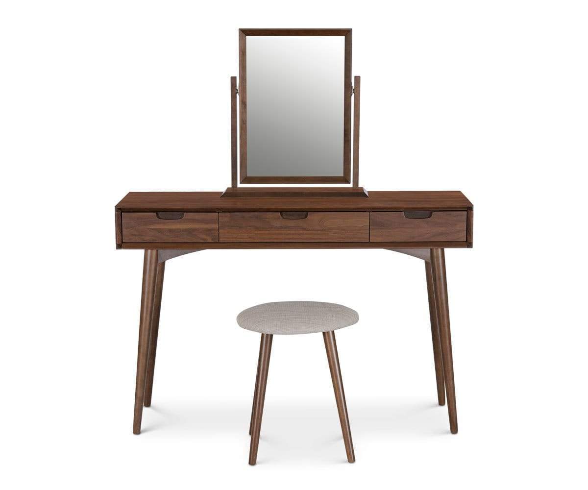 An elegant addition to your bedroom space, the Juneau vanity has a mid-century feel and is constructed of solid beech with a walnut veneer and offers three drawers produced with French dove tail joints. Includes an adjustable mirror and matching stool with splayed tapered legs and a fabric seat.