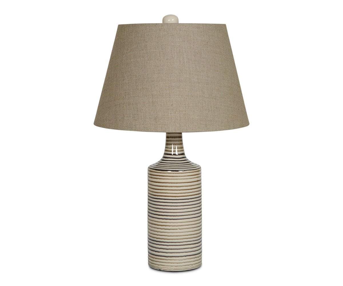 Illuminate your room while adding visual interest with the Viveka table lamp. Just the right size to suit many locations throughout your home without overtaking the space, its neutral colors easily blend with many styles of interior design. The glossy ceramic base features pleasing stripes which complement the texture of the beige fabric shade. Together, this piece becomes a practical accessory that adds personality to your decor.